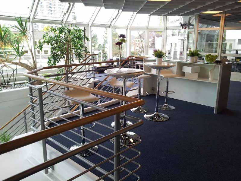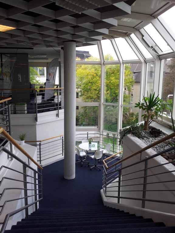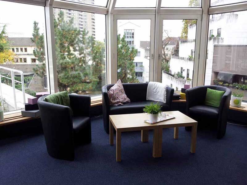 Bildung hat in diesen Räumen Tradition: Das Gebäude war früher eine Schule, die später zur Büronutzung umgebaut wurde. Eine Buchhandlung befindet sich mit im Haus. Das IBB belegt die Etagen zwei und drei, die mit dem Fahrstuhl zu erreichen sind. Über einen großzügigen Eingangsbereich im Lounge-Stil mit Infomonitor und verglaster Galerie erreichen Sie die modernen Schulungsräume. Deren große Fenster lassen viel Licht herein und geben die Sicht auf grüne Gärten, den Rhein und eine Parkanlage frei. Sogar von einer Dachterrasse aus lässt sich die schöne Aussicht genießen. Der Pausenraum mit seiner Galerie, der Theke und den Barhockern sowie separierter Teeküche ist der ideale Ort zum Entspannen und lockeren Plaudern zwischendurch.