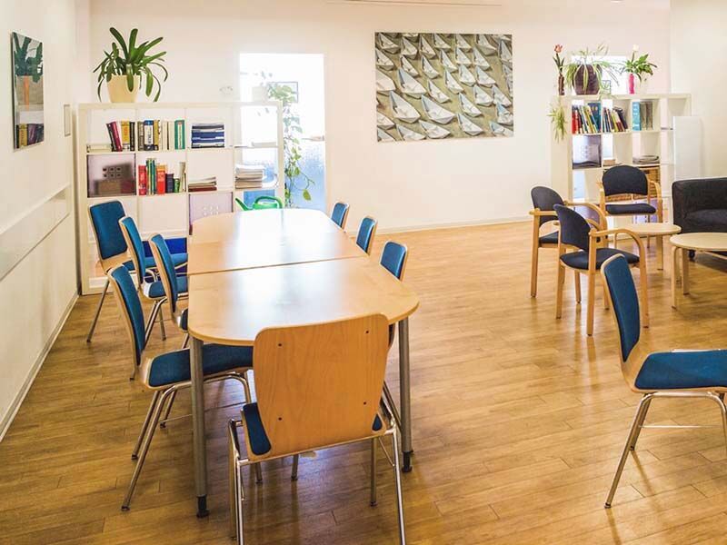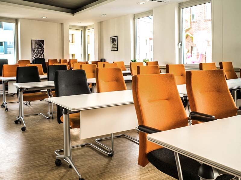 Die Schulungsräume liegen im Erdgeschoss und zweiten Stock des Bürokomplexes. Je nach Gebäudeseite sind sie in Richtung des ruhigen Innenhofs ausgerichtet oder zur Straße hin. Im zweiten Fall sorgt eine Klimaanlage dafür, dass Sie beim Lernen einen kühlen Kopf bewahren. Hohe Decken, dekorative Bilder sowie Böden in Parkett-Optik bilden eine angenehme Umgebung.