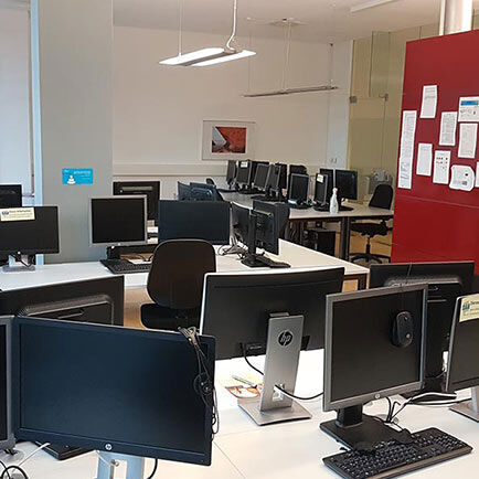 Über eine Treppe (auch rollstuhlgerechter Zugang möglich) erreichen Sie den großzügigen und offenen Eingangsbereich mit Verwaltung/Anmeldung und die Schulungsräume. Ihr Unterricht findet hier zwischen 8 und 16:15 Uhr statt. Hohe Decken, durchgängige Fensterfronten sowie Glaswände und -türen sorgen für ein luftiges Raumgefühl. Die Aussicht geht zum Teil in Richtung der parkähnlichen Anlage mit Bänken hinter dem Haus. Dort können Sie sich in Pausen bei idyllischem Vogelzwitschern entspannen. Wenn Sie lieber drinnen bleiben möchten, machen Sie es sich auf der Sitzecke gemütlich. Hier im Pausenbereich finden Sie auch einen Automaten für erfrischende Kaltgetränke sowie einen Kaffeeautomaten mit verschiedenen Heißgetränken. In der kleinen Küche stehen Kühlschrank, Geschirr, Spülmaschine und Wasserkocher bereit. Viele Teilnehmer nutzen die Mittagspause auch für einen Spaziergang zum Limpurger Platz, einem kleinen belebten Marktplatz, um sich etwas zu essen zu holen. In der anderen Richtung liegen ein Discounter und Getränkemarkt.