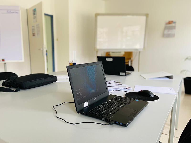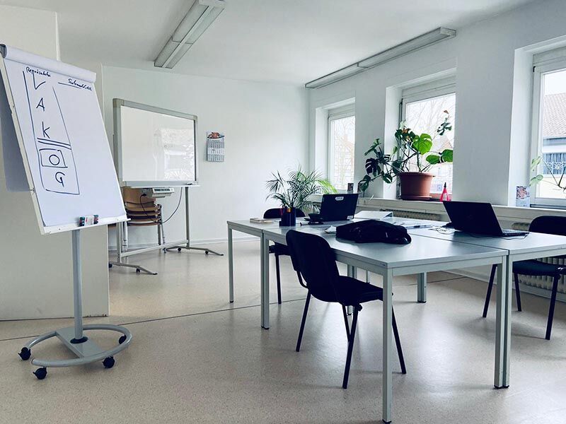 Ihre Schulungsräume begrüßen Sie im ersten Stock des historischen Altbaus, in dem früher das Amtsgericht war. Durch die hohen Decken und großen Fenster entsteht ein luftiges Raumgefühl. Der Blick nach draußen fällt teilweise ins Grüne und auf den Turm der alten Stadtkirche. Ihr Unterricht findet zwischen 8 und 16:15 Uhr statt.