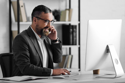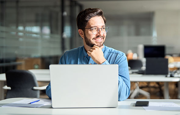 Mann sitzt am Laptop und dent über eine externe Abschlussprüfung nach